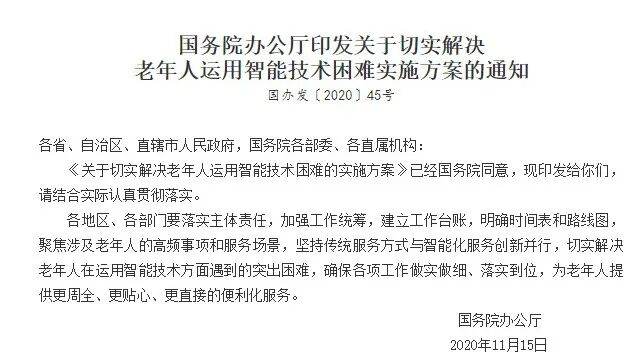 那就是国务院办公厅本周对外公布了《关于切实解决老年人运用智能技术困难实施方案》。