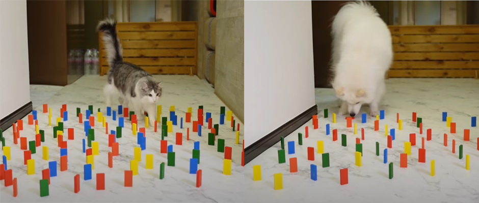 今天的这个视频是这个频道中播放量最高的一个,从今年4月上架到现在,在油管上播放了近4300万次,内容是当主人(仆人?)在过道里用多米诺牌摆下密密麻麻的障碍。那面对挑战,牛奶和爆炸会怎么表现呢?(这时候糖还没出生)