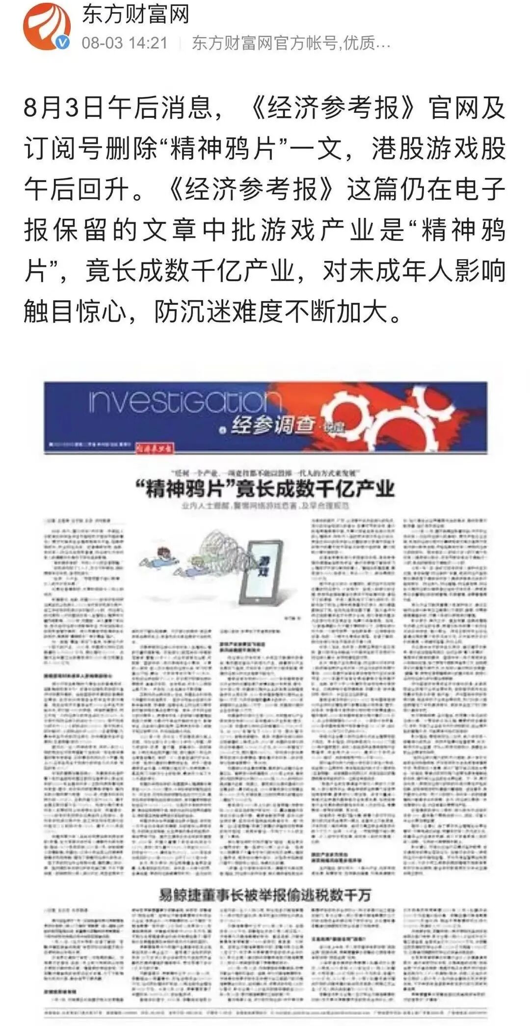 昨天早上,一些游戏相关公司的股价出现了剧烈波动,原因是网上传播了一篇文章,某央媒说“网络游戏是长成数千亿的精神鸦片”,刚刚经历过教培产业暴跌的股市投资者,认为这是又一次的政策调整,瞬间就作出了反应。