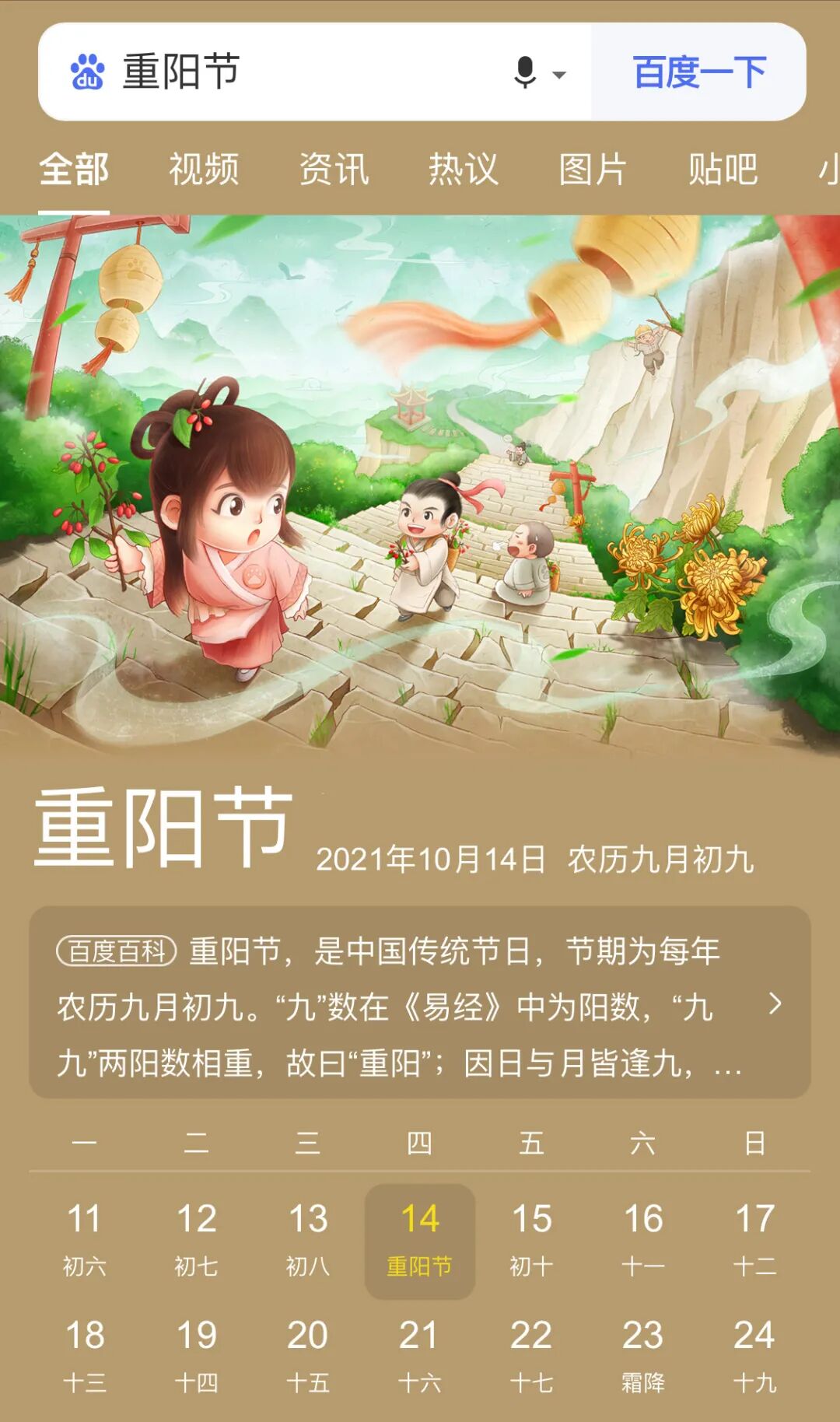 10月14日,农历九月初九,是中国的一个传统节日,重阳节。重阳节经过很多年的演变,各地都有一些不同的习俗。不过总结起来大概有登高、秋游赏菊、祭祖、佩茱萸等等。