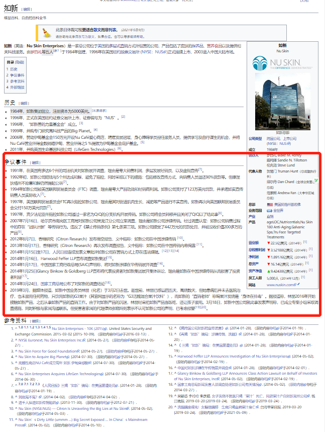 更有趣的是,在如新英文wiki页面的开篇部分,上来就是满满一大段关于如新公司如何在美国、中国各种违规,被各种起诉、处罚的内容。这么“另类”的公司介绍,想来你很难在任何一家正经公司的wiki页面上看到。