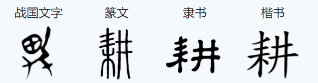“耕”字最早出现在战国,形状就是一个人在用农具耕田。这也是后来有“耕”和“畊”两种不同写法的由来 —— 一种着重于耕的对象,一种着重于耕。