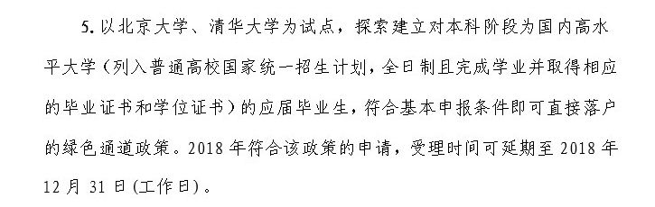 与往年不同的是,本次办法提出了将以清华大学和北京大学为试点,探索建立对本科阶段为国内高水平大学的应届毕业生,符合基本申报条件即可直接落户的绿色通道政策。