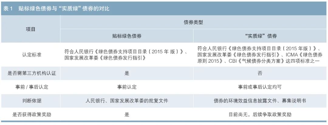 我国还存在大量未贴标、实际投向绿色项目的“实质绿”债券,它们也为推动绿色发展作出了积极贡献。所谓“实质绿”债券,是指募集资金投向符合人民银行《绿色债券支持项目目录(2015年版)》、国家发展改革委《绿色债券发行指引》、国际资本市场协会(ICMA)《绿色债券原则》、气候债券倡议组织(CBI)《气候债券分类方案》这四项绿色债券标准之一,且投向绿色产业项目的资金规模在募集资金中占比不低于50%的债券。对于“实质绿”债券的认定,中央结算公司和中节能咨询有限公司(以下简称“中节能”)已开展三年,并通过中国债券信息网定期发布识别出的“实质绿”债券。截至2020年末,已识别2017只“实质绿”债券,规模为5.3万亿元,其中贴标绿色债券1.3万亿元。贴标绿色债券与“实质绿”债券的对比如表1所示。