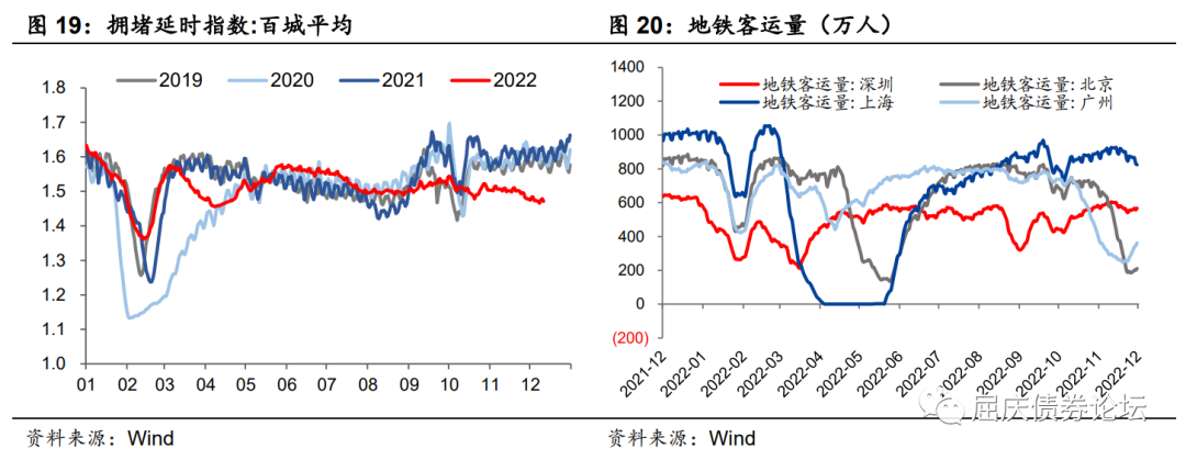 百城平均拥堵延时指数月环比下降0.2%;上周13座重点城市地铁客运量环比回升22.6%,其中,上海、北京、广州、深圳四个城市环比均有明显回升,分别为5.9%、58.3%、59.5%和17.8%。疫情防控“新十条”不再对跨区域流动人员开展落地检,出行政策不断优化,叠加此前低基数影响,北京、广州地铁客流量大幅回升,但绝对水平仍处于低位,预计近期还有回升空间。