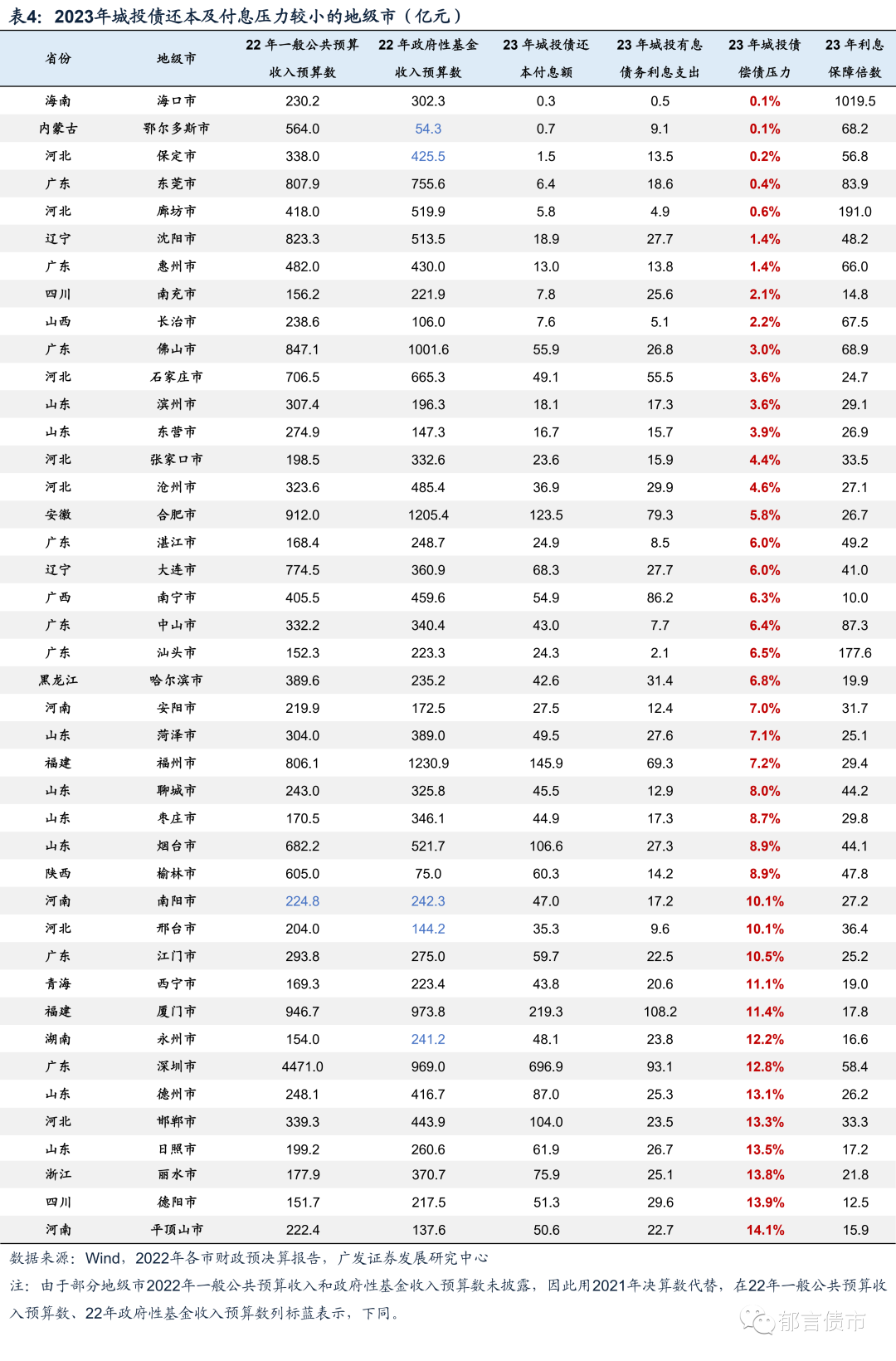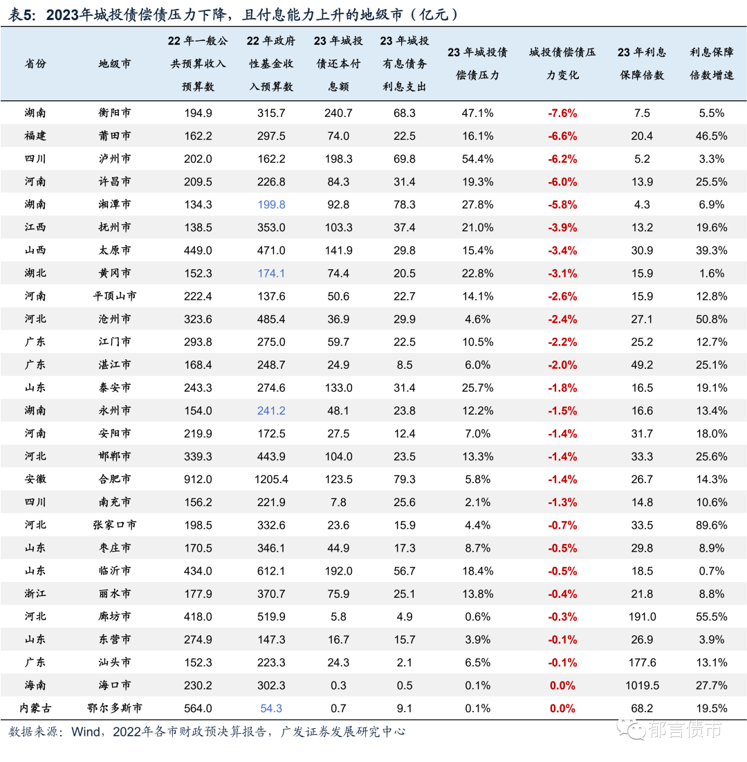 地级市层面,我们筛选出同时满足2023年城投债偿债压力小于15%,利息保障倍数大于10倍,2021年及2022年一般公共预算收入+政府性基金收入在300亿元以上的地级市,供投资者参考,其2023年偿债及付息压力相对较小。