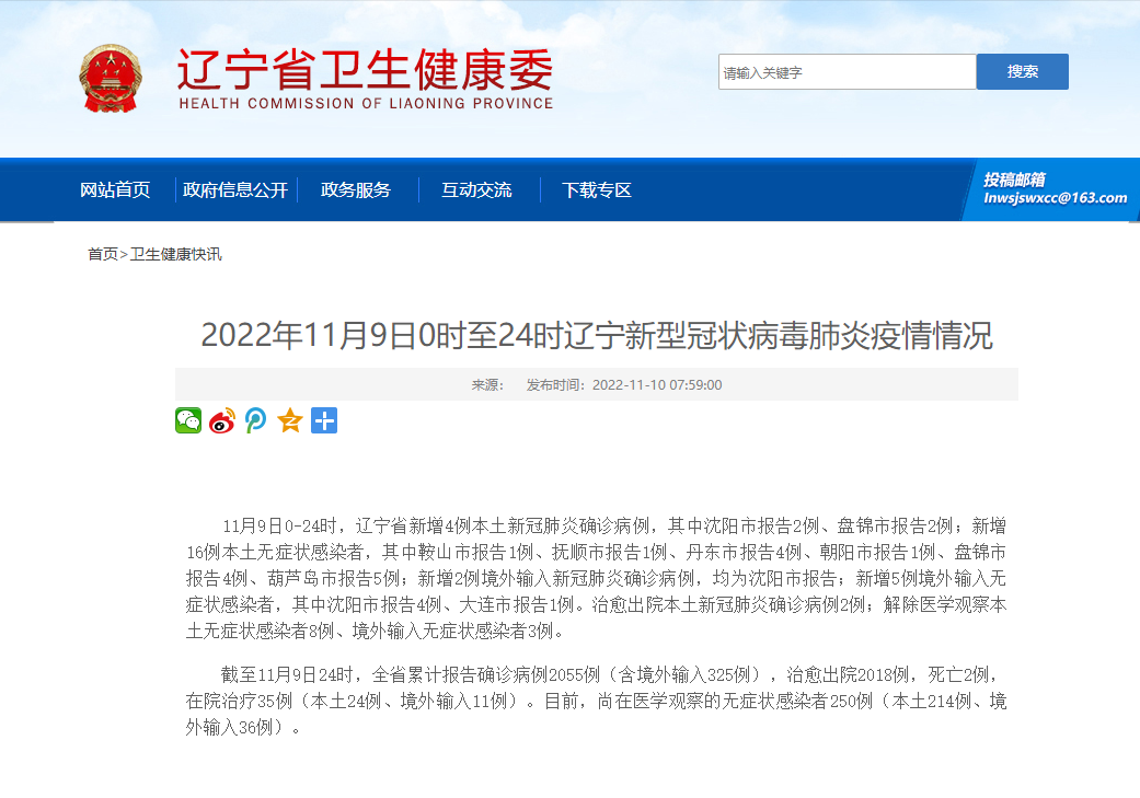 11月9日0-24时,辽宁省新增4例本土新冠肺炎确诊病例,其中沈阳市报告2例、盘锦市报告2例;新增16例本土无症状感染者,其中鞍山市报告1例、抚顺市报告1例、丹东市报告4例、朝阳市报告1例、盘锦市报告4例、葫芦岛市报告5例;新增2例境外输入新冠肺炎确诊病例,均为沈阳市报告;新增5例境外输入无症状感染者,其中沈阳市报告4例、大连市报告1例。治愈出院本土新冠肺炎确诊病例2例;解除医学观察本土无症状感染者8例、境外输入无症状感染者3例。