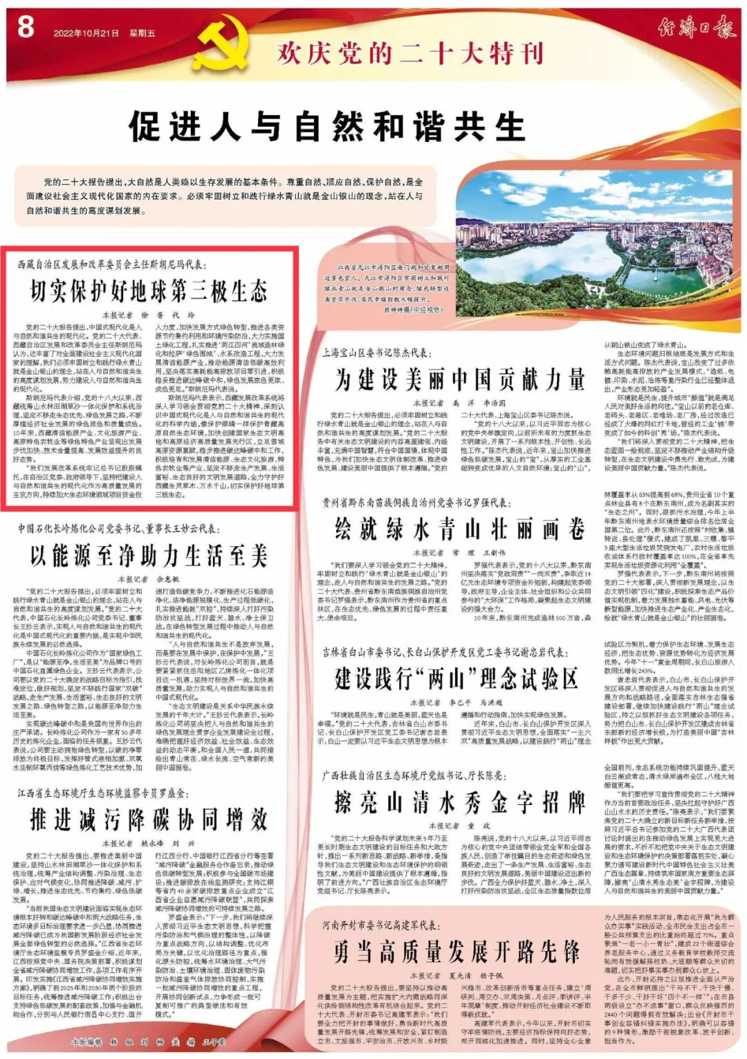 经济日报“促进人与自然和谐共生”特刊报道中,党的二十大代表、西藏自治区发展和改革委员会主任斯朗尼玛说,10年来,西藏清洁能源产业、文化旅游产业、高原特色农牧业等绿色特色产业呈现出发展步伐加快、技术含量提高、发展效益提升的良好态势。