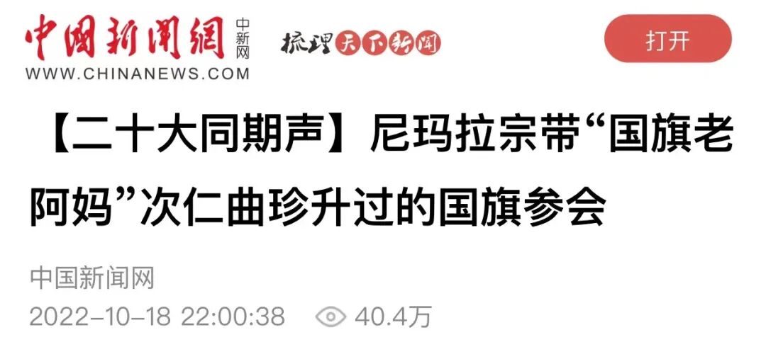 中新网推出报道《尼玛拉宗带“国旗老阿妈”次仁曲珍升过的国旗参会》,讲述了党的二十大代表、聂拉木县樟木镇雪布岗社区主任尼玛拉宗带“国旗老阿妈”次仁曲珍升过的国旗参会的感人故事。