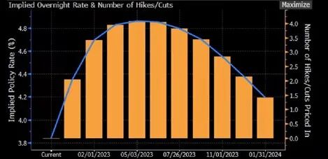 图2:今天的市场预期美联储将在几个月后就停止加息,并在明年下半年加速降息