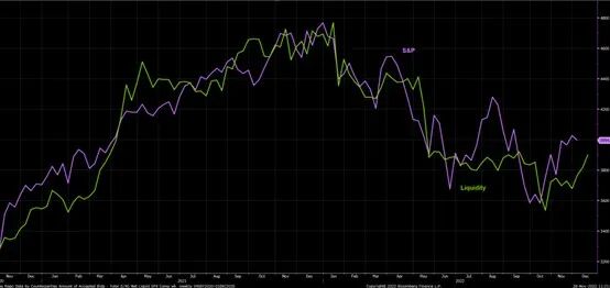 图1:美国中期选举后,标普500走势(芝商所股指期货代码:ES)与金融流动性指标(下图绿色)同步回暖