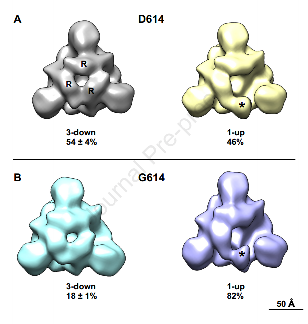 研究人员通过电镜发现,虽然614位于RBD区域之外,但是会影响S蛋白的结构,突变后导致RBD区域更容易暴露出来,进而被抗体识别。