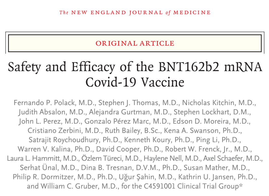 Safety and Efficacy of the BNT162b2 mRNA Covid-19 Vaccine. N Engl J Med. 2020 Dec 10. doi: 10.1056/NEJMoa2034577.