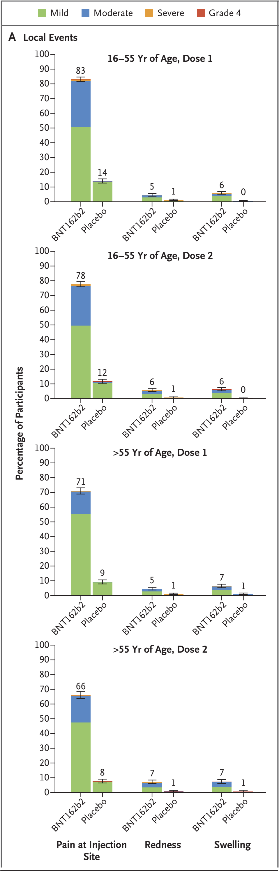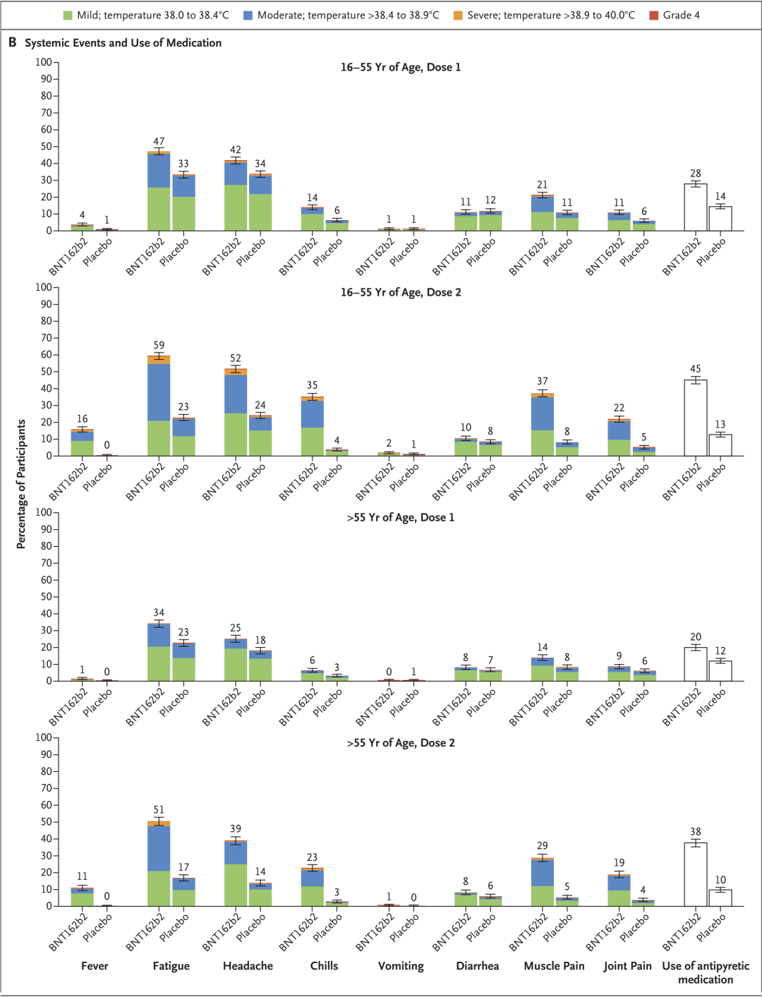 BNT162b2的安全性良好,常见的不良反应为注射部位疼痛,乏力和头痛。这些不良反应持续时间较短,症状轻微,一般1~2天后可自行消退。严重布不良反应发生率较低,BNT162b2组和安慰剂组的发生率相似。