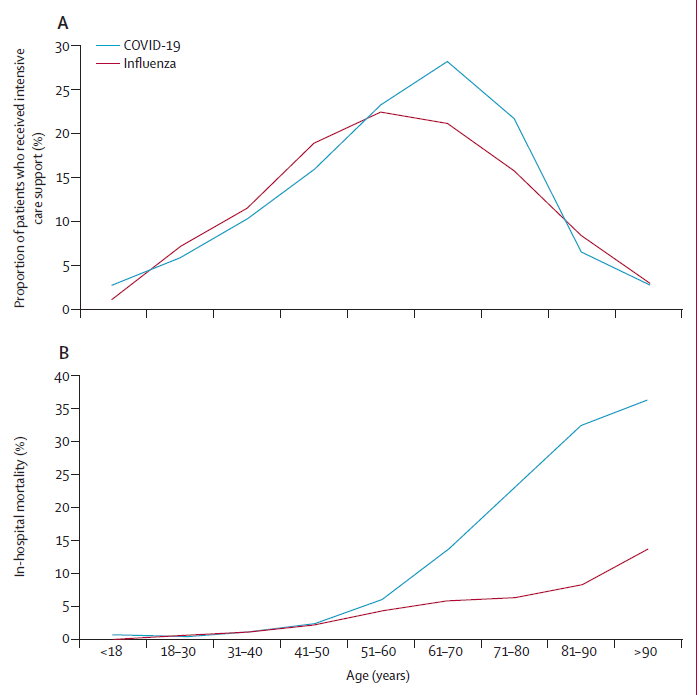 图1:在法国住院的因COVID-19或季节性流感住院患者的需要ICU治疗的比例和死亡率,按入院时的年龄分层