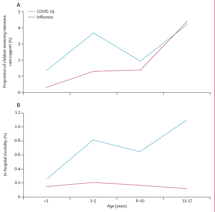 COVID-19患者的院内死亡率(16.9%)高于流感患者(5.8%)。COVID-19总体死亡风险为2.9,而经年龄标准化死亡率的病死率为2.82。住院患者中,COVID-19患者小于18岁的比例(1.4%)远小于流感患者(19.5%);但小于5岁的患者中,COVID-19患者需要ICU治疗的比例显著更高。在11-17岁年龄段的住院患者中,COVID-19患者的病死率(1.1%,5/458)比流感患者高10倍(0.1%,1/804)。