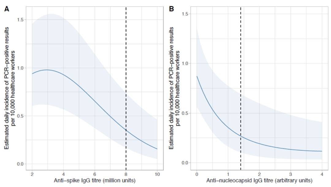 此外,研究人员还发现,无论S蛋白或是核衣壳蛋白抗体,其基线滴度越高,随访过程中核酸检测阳性发生率就越低。