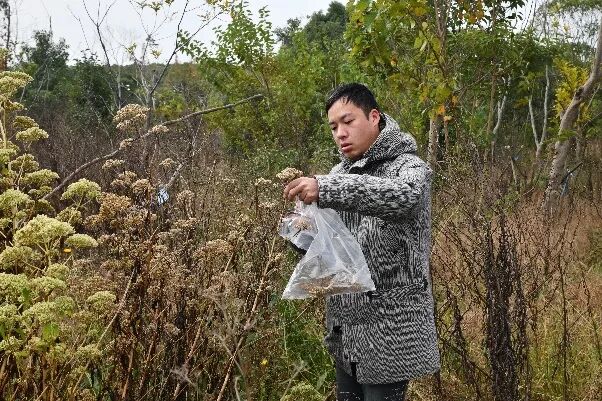 城市荒野工作室工作者采集攀倒甑种子。(图片来源 / 城市荒野工作室)