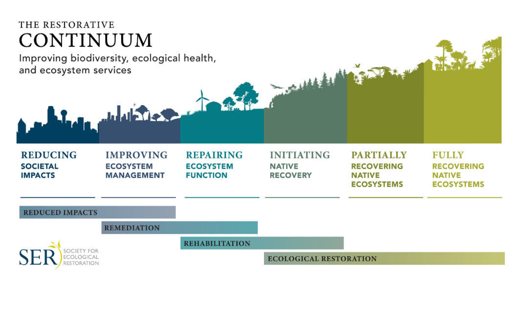 根据联合国环境规划署(UNEP)的定义,广义的“生态系统恢复”(ecosystem restoration)是“一个扭转生态系统(如大地景观、湖泊和海洋)退化,以恢复其生态功能的过程;换言之,提高生态系统的生产力和承载力以满足社会的需求。可以通过允许被过度开发的生态系统进行自然再生或种植树木与其他植物来实现”。这事实上包含了非常广泛的生态系统管理干预措施。根据生态修复协会(Society for Ecological Restoration,SER)对该概念的界定,生态系统恢复至少包含四类不同程度的生态系统管理干预措施(如下图),从恢复程度由低至高排列,分为降低影响(reduced impacts)、整治(remediation)、复原(rehabilitation)、生态修复(ecological restoration)。其中,“生态修复”(ecological restoration)是最高水平的生态系统恢复行为,目标在于将指定区域完全(或部分)恢复到没有发生退化前的状态。而其他生态系统管理干预措施则并未要求将指定区域恢复成退化前的状态。