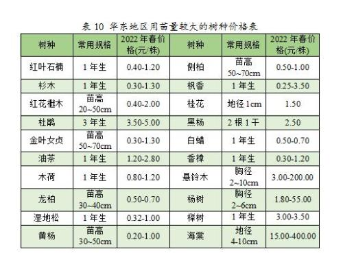 华东地区用苗量较大的树种价格表。(图片来源/国家林草局国有林场和种苗管理司《2023年度全国苗木供需分析报告》)
