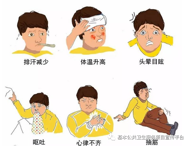热射病:典型的临床表现为高热、无汗和意识障碍。体温迅速增高达41℃以上,出现嗜睡、淡忘和昏迷。皮肤干热,无汗,呈现潮红或苍白,脉搏加快,血压下降,呼吸快浅,四肢和全身肌肉可有抽搐。