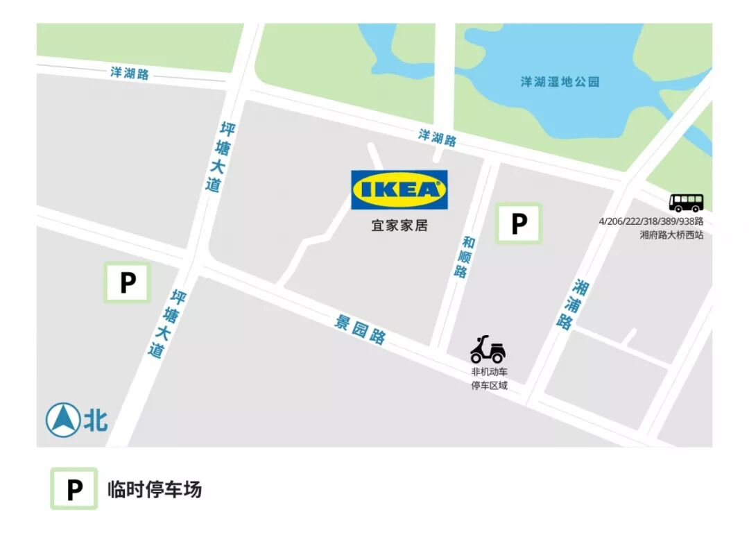 宜家的地理位置也比较便利,有4/206/222/318/389/938路公交车至湘府路大桥西站,不过小编在此建议您步行走湘浦路绕行至和顺路更为方便。