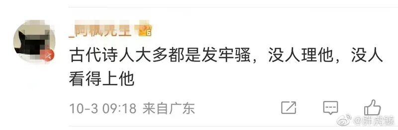 这就是典型的因为不了解造成的误会。他印象里李白只有类似“白发三千丈”,所以说李白只会吹牛逼。