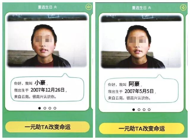 然而,很快有网友“晒”出了这个活动的疑点:在5月5日出生的受助人显示为“阿豪,出生于2007年”,同一张照片也在12月26日的受助人一栏中出现,姓名变成了“小豪”。