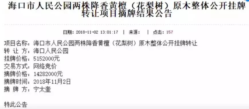 11月2日,海南省海口市人民公园两棵已经枯死的降香黄檀经过网络拍卖,最终以1428.2万元的价格成交。