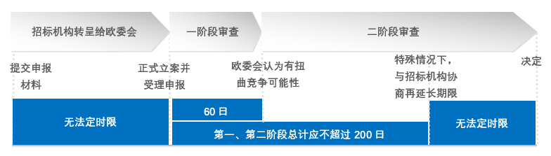 需注意的是,申报将由招标机构转呈欧委会,欧委会收到该申报后才开始正式立案审查,但《新规草案》对于招标机构转呈给欧委会的时间并没有法定限制。同时,在第二阶段审查时,《新规草案》规定在特殊情况下,在与招标机构协商,欧委会可以再延长审查期限,但是对于特殊情况包括哪些,最多可以延长多长时间,《新规草案》并未规定,有待进一步观察。