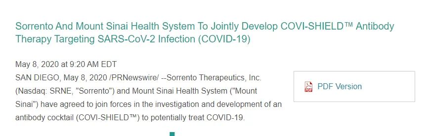 Sorrento和Mount Sinai联合称:正在研发的抗体混合液 “COVI—SHIELD”可以保护人体不受病毒侵害长达两个月,并根据需要来制定使用周期。目前Mount Sinai已经完成所有IND(新药临床试验)的申请文书,请求FDA优先评估和加速审查,并且预计第一阶段临床试验于2020年第三季度开始。