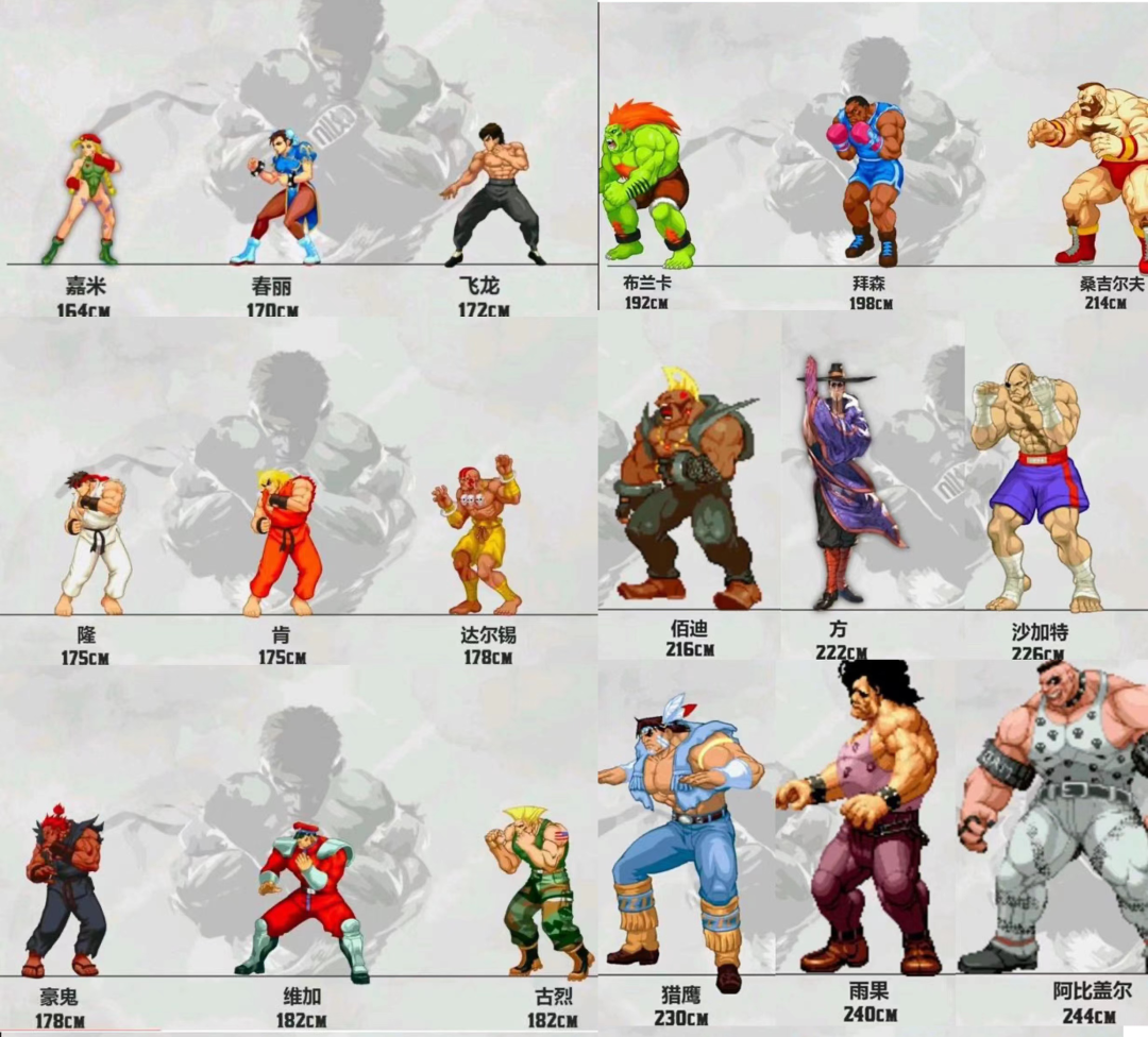 当年在街霸1和街霸2中最高的是沙加特,有226cm,由于有身高优势,所以手脚的攻击判定相对远一些,这也是我当时很气的点。我想,如果以后角色越出越高,那对小个子来说,岂不是还没够着就挨打了吗?果真后来的角色越出越高,还好暂时没出三四米的角色,不然屏幕可能都装不下了。想必之后的角色大家也都清楚,像230cm的猎鹰、240cm的雨果,都符合这个规律。