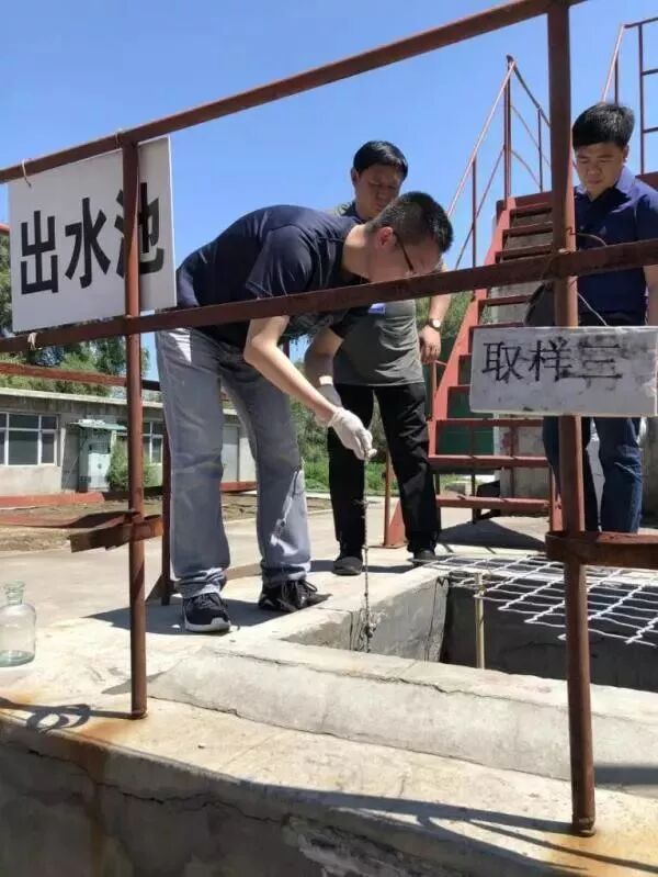 ▲ 督查组监测人员对位于安泰生物工程有限公司内,担负黑臭水体旁边三家企业排污功能的污水处理站出水池进行采样监测。