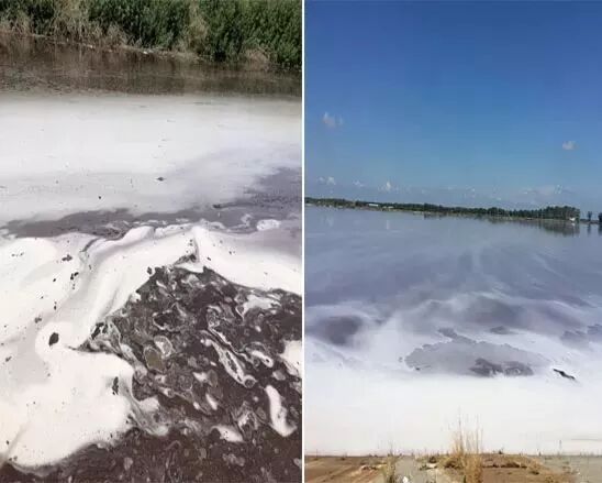 ▲ 远看,巨大的黑臭水体上漂浮着白色泡沫,散发着刺鼻的臭味。人民网记者 余璐 摄