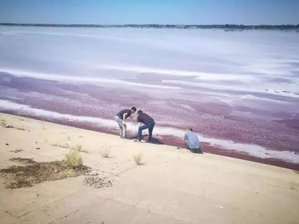 ▲ 水面上漂浮着不明白色泡沫和结块的红色固体。人民网记者 余璐 摄