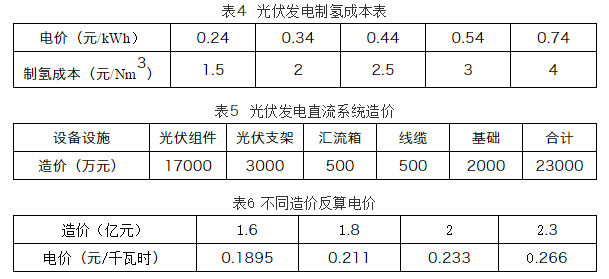 以1000Nm3/h水电解制氢为例,总投资约1400万元,按照1Nm3氢气消耗5kWh电能计算,不同电价测算制氢成本分析如表4。由此分析,光伏发电制氢电价控制在0.3元/千瓦时以下时,制氢成本才具有竞争力。按照目前市场价格进行测算,以100MW光伏发电直流系统造价如表5。