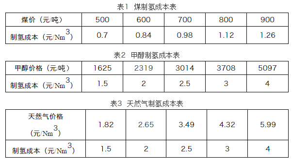 天然气制氢单位投资成本低,在1000Nm3以上经济性较好,按照1Nm3氢气消耗0.6Nm3天然气,天然气价格按1.82元/Nm3计算,制氢成本如表3。