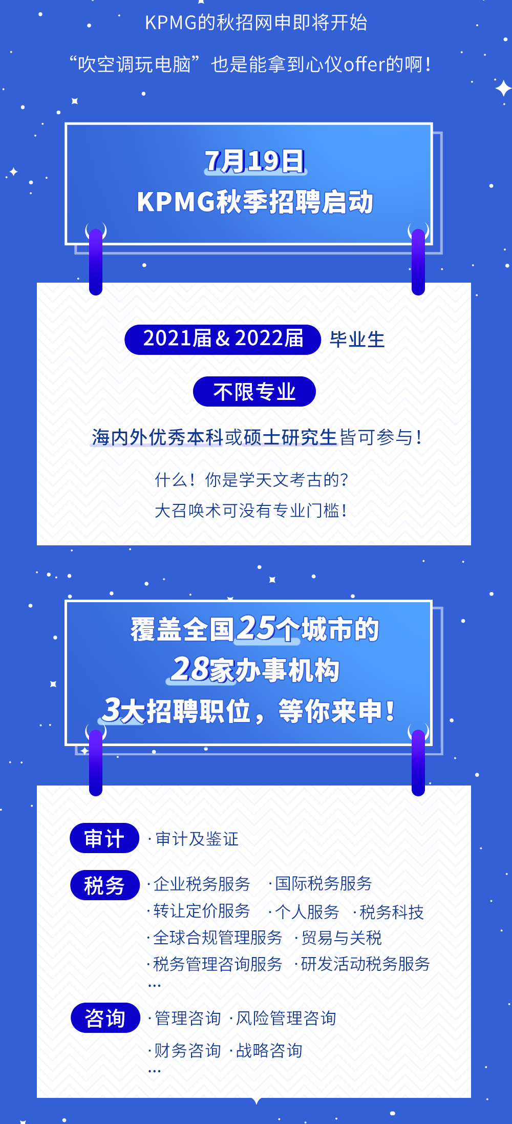 About Feature 毕马威 (KPMG) 中国官方招聘平台。定期发布最新职位信息,公司新闻,热门活动等。毕马威是一家网络遍布全球的专业服务机构,专门提供审计、税务、咨询等服务。