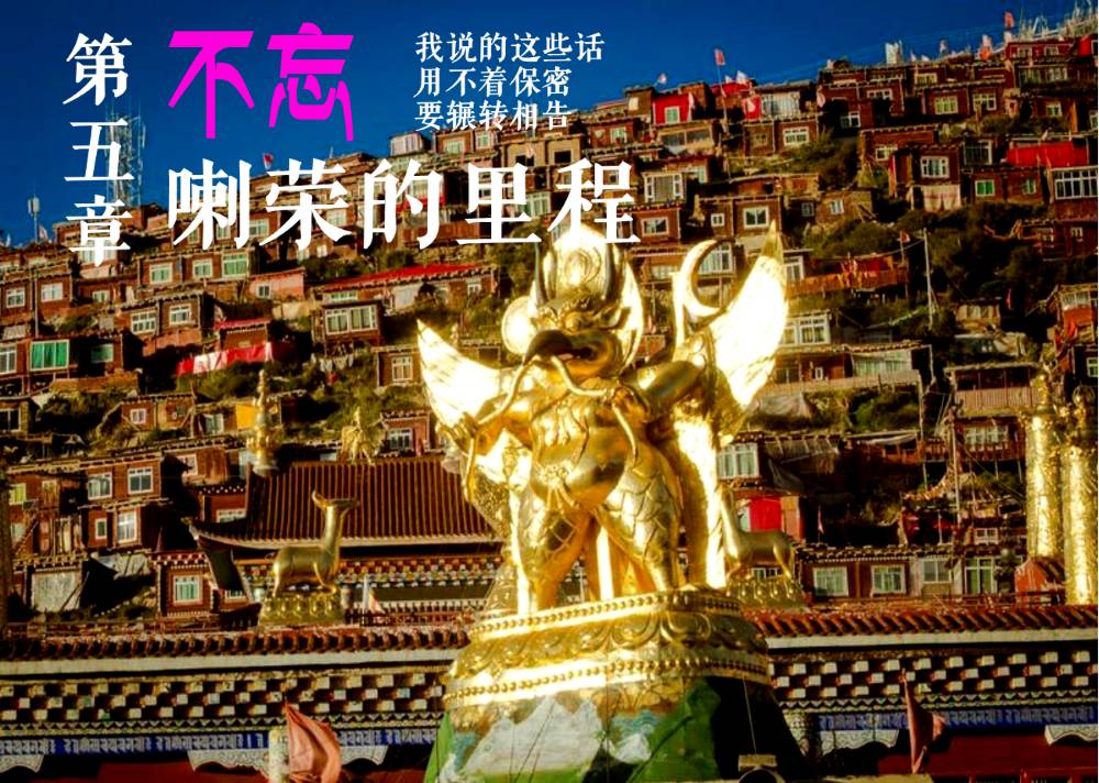 这是第五章,是讲述喇荣的里程的,第一节也就是34节讲了法王如意宝从建立喇荣五明佛学院以来的大事记。这是为了让所有的众生都接引到极乐世界,不是为了名,也不是为了利,标志就是大鹏旗帜,在全球的每一个角落已经飘扬。