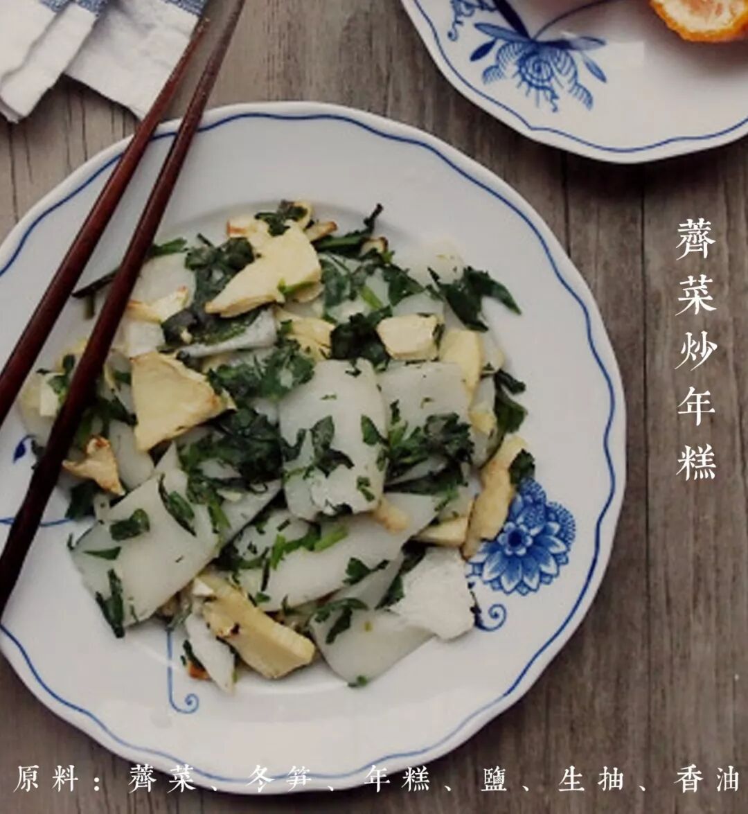 做法:荠菜剪去根部,冬笋去皮切片;水烧热,将荠菜和冬笋分别焯一下;荠菜切碎,年糕切成3cm左右的片状;起油锅煸炒冬笋片,加入荠菜末煸炒,放入年糕片一起翻炒,待年糕变软后,调入适量盐便可。