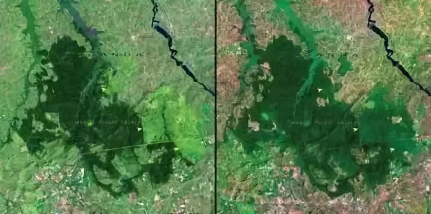 巴西郎多尼亚森林从1975年6月的翠绿变成了2009年8月逐渐光秃的模样。