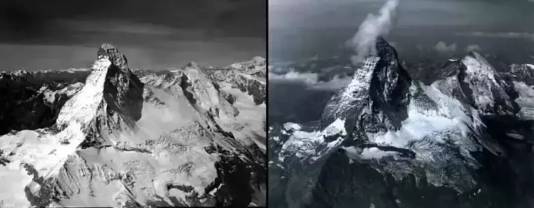 瑞士马特洪峰,1960年8月时同样覆盖着白雪,到了2005年8月时却越来越少。