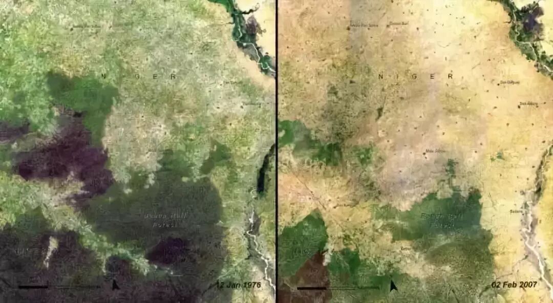 1976年和2007年,尼日尔Baban Rafi森林的砍伐情况。