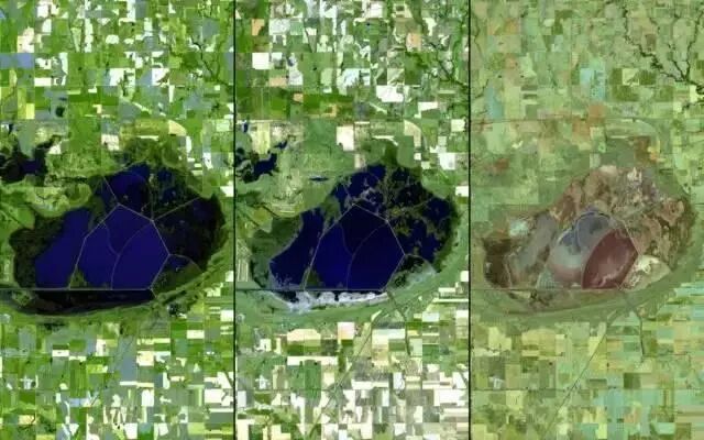 1998年和2011年,阿根廷拉古纳马奇奎塔湖的变化情况。
