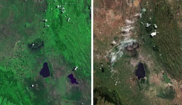 1973年到2015年,纳库鲁湖国家公园肯尼亚的森林砍伐情况。