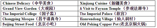 6. 课程汇报。课程以语言输出能力为导向,在12周安排一次课程汇报,要求学生选择本学期的任意中国文化主题,以小组为单位进行外景视频录制。学生可出境,进行同期录音,也可在后期制作中进行配音。视频时常5-7分钟,用英语针对选定主题进行层次分明、结构清晰的介绍,同时还要结合现场汇报连成一个有机整体。如学生选择前往北京一个名胜古迹进行场景录制,可在视频中对该景点的历史、文化、结构、作用等内容进行介绍,然后在现场以旅游节目对谈的形式进行呈现。学生课程汇报主题包括:
