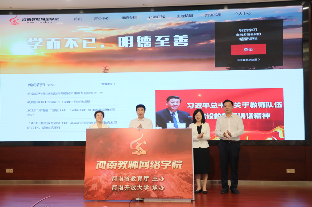 9月8日,“河南教师网络学院”揭牌仪式在河南开放大学举行。副省长、省教育厅党组书记、厅长宋争辉,省教育厅副厅长毛杰出席揭牌仪式,学校党委书记赵继红、校长孙斌等校领导及处级干部参加会议。会议由校长孙斌主持。 宋争辉、毛杰、赵继红、孙斌共同为“河南教师网络学院”揭牌。