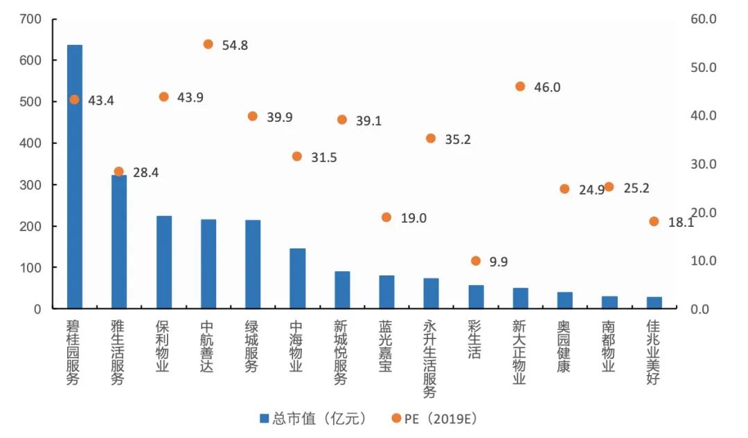 2018年,物业管理企业上市进程加速,全年A股新增1家,港股新增5家。而2019年又新上市5家。目前市值超百亿的物业企业达5家,其中碧桂园服务以706亿港币独占鳌头,估值排名前三的公司依次为碧桂园服务(43.1X)、中航善达(40.4X)、绿城服务(40.2X); 估值排名后三的公司依次为彩生活(9.7X)、佳兆业美好(17.5X)、蓝光嘉宝(18.3X)。