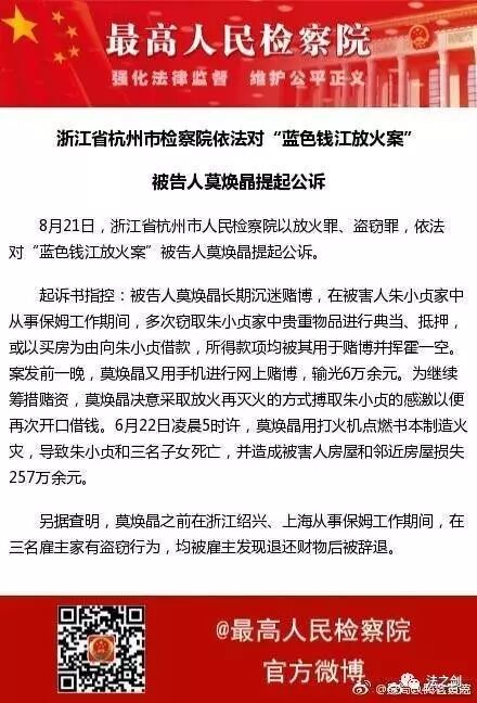 前天,看到最高人民检察院官方微博的发布的新闻信息:821日,杭州市人民检察院以放火罪、盗窃罪,依法对“蓝色钱江放火案”被告人莫焕晶提起公诉。