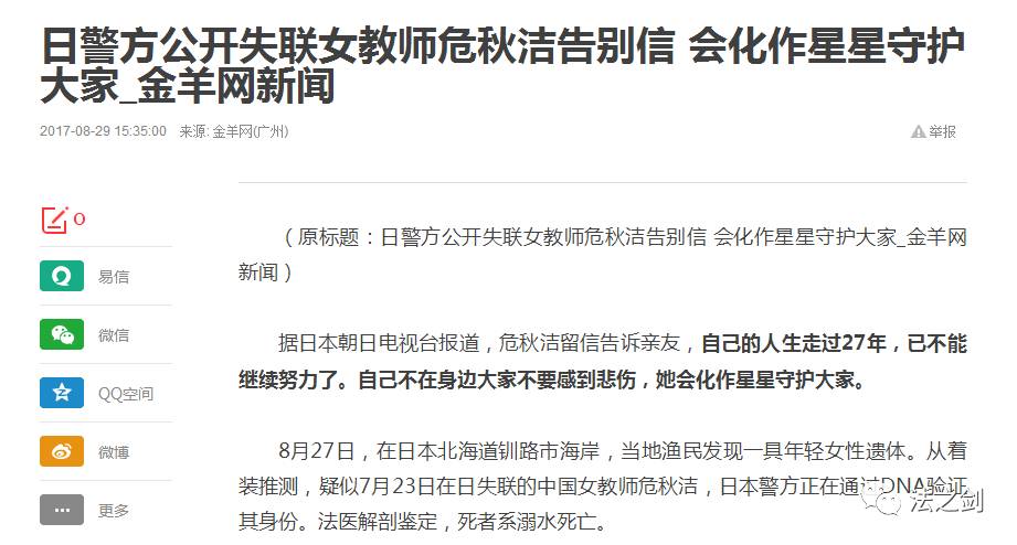 我现在想,如果真是危秋洁的话,那真是件令人痛惜的事情。一个年仅27岁,正处在花样年华的姑娘,为什么就溺水身亡了呢?还有,如果日媒披露的遗书真是出于危秋洁亲笔的话,她为什么如此地厌倦人生?